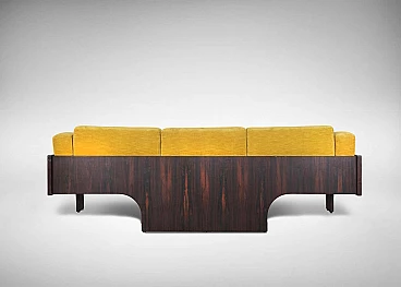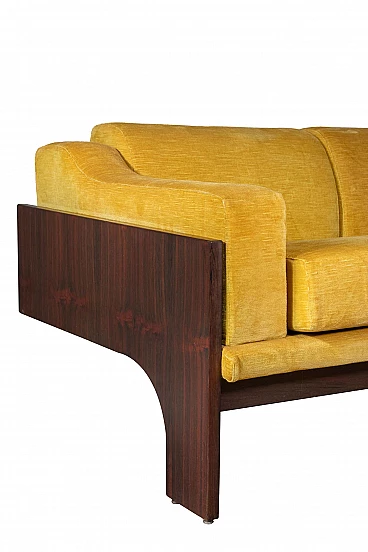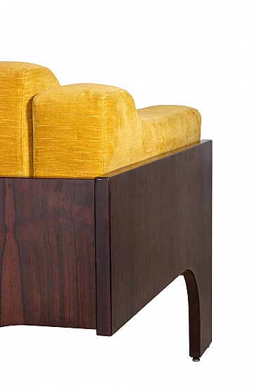 The lounge set is an original design object created in the 1970s by Claudio Salocchi (Milan, 1934-2012) for Sormani. Created in Italy in the second half of the 20th century. Made of rosewood and light yellow velvet. Armchairs: h. 68 x w. 85 x d. 85 cm - seat height: 41 cm. Sofa: h. 68 x w.195 x d. 85 cm - seat height: 41 cm. Salocchi was an Italian furniture and industrial designer and architect. He graduated in architecture from the Milan Polytechnic. Claudio Salocchi produced numerous furniture and lighting designs and, in parallel, devoted much time and effort to researching different applications of aluminium alloys, optimising furniture heights and layouts for work and home environments and using new and unfamiliar configurations that did not compromise the practicality of the piece. In 1960, Claudio Sormani designed his iconic Revolving bookcase for the Sormani furniture factory. In 1965 he set up his own design studio and in 1967 formalised what was to be a prolific collaboration with Sormani, for whom he went on to design, among others, the Palla polyurethane chair (1966), the Appogio polyurethane chair (1971), the Lia aluminium chair (1966), the Ellisse aluminium table (1967) and the Napoleon aluminium table (1973). In 1979, Salocchi was awarded the prestigious Compasso d'Oro for his work and research in the design of Metrsosistema domestic appliances with the manufacturer Alberti.