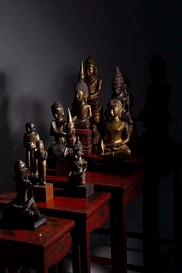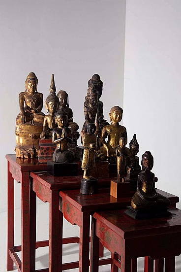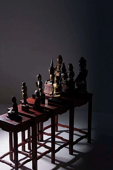 In the realm of antique furniture, your nesting quartet of Chinese red lacquer side tables is a fascinating treasure that bridges the gap between two centuries, showcasing the timeless charm of Chinese craftsmanship. These remarkable tables, dating from the late 19th and early 20th centuries, are a testament to the rich artistic heritage that exudes elegance. Each of the four tables is a work of art in its own right, adorned with breathtaking landscapes depicting the sublime beauty of nature and Chinese temples. The scenes come to life with the delicate touch of golden brushstrokes, infusing them with a sense of opulence and grace. These intricate landscapes, with their flowering branches and shimmering gold accents, transport you to a world where nature and spirituality intertwine. The quartet-shaped tables, resplendent in their red lacquer, are a hallmark of 19th-century Chinese design sensibilities. Their elegant forms, characterized by clean lines and harmonious proportions, speak of the refinement and sophistication of the era. What makes them truly exceptional is their ability to nest within one another, transforming into a unique and harmonious table. Every inch of these tables has been meticulously decorated by expert hands, as evidenced by the intricate details that grace every corner. The meticulous workmanship is a testament to the dedication and craftsmanship of the Chinese artisans who brought these tables to life. It is as if the essence of their devotion is embedded in every golden brushstroke and pattern. The charm of these side tables is undeniable: they exude an Eastern mysticism that invites you to linger in their presence. They carry with them the aura of an ancient culture steeped in tradition and spiritual reverence. Placing them in your home is like inviting a piece of China's enchanting history into your space. These side tables are not limited to a single design style, but possess a chameleon-like quality that allows them to blend seamlessly into various environments. Whether it's a Chinoiserie-inspired interior or a glamorous Regency Revival-style setting, these tables are the perfect focal point for adding an air of timeless elegance and cultural richness.