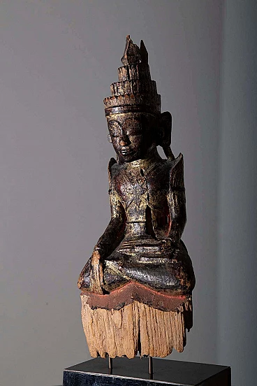 In the mid-18th century, in the enchanting land of Burma during the Shan period, a magnificent masterpiece of spiritual art was born: an extraordinary seated Burmese wooden crowned Buddha, often called "King Buddha." This sacred sculpture transcends the boundaries of ordinary representations, adorned with diadems and regal ornaments rather than conventional monk's robes, embodying a unique symbol of royal divinity. Looking at this splendid Buddha, you will be transported to a realm where spirituality and royalty converge. This crowned Buddha, with its majestic three-tiered crown, indicates not only the Buddha's enlightened wisdom but also his universal role as a benevolent ruler, a symbol of serene authority. It is as if the very essence of sovereignty and spiritual wisdom is woven into the intricate carvings and serene face of this sacred figure. The passage of time has left its mark, with the underside bearing the signs of age and wear. Yet, the colors endure, still vivid and bright, as if untouched by the hands of time. Amid the shades of red and the small strokes of gold, the skill of Rever's 18th-century artisans emerges, a testament to their skill and reverence for the divine. This crowned Buddha, cradled on a wooden pedestal, represents a bridge between the earthly realm and the heavenly heights. It is a tangible link to a bygone era, a living testimony to the spiritual devotion and artistry of its creators. In the presence of this extraordinary Buddha, you will find yourself caught up in a sacred embrace of wisdom and sovereignty, a reminder of eternal truths that transcend the ages. It is not just a work of art: it is a beacon of divine grace, a treasure that whispers stories of a distant time and place, and a symbol of enlightenment that continues to shine in the present moment.