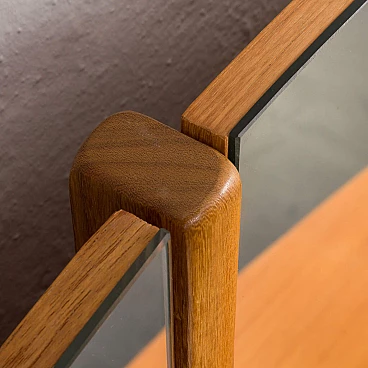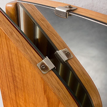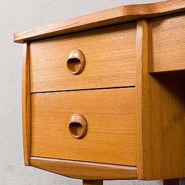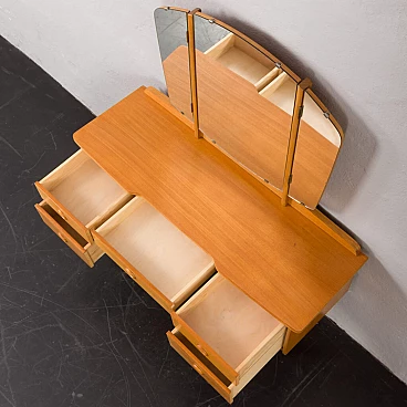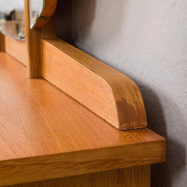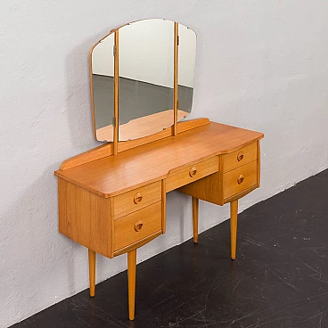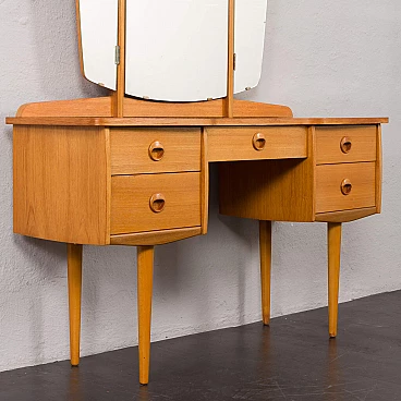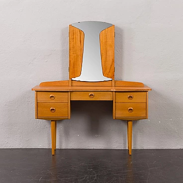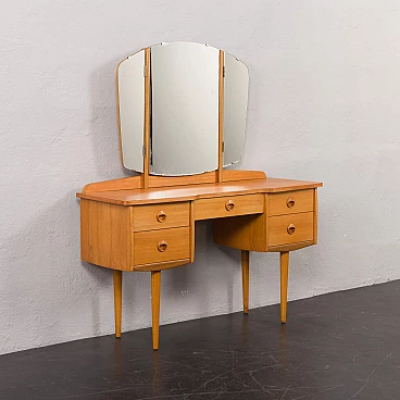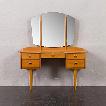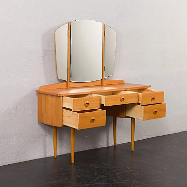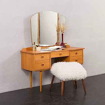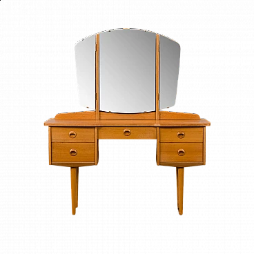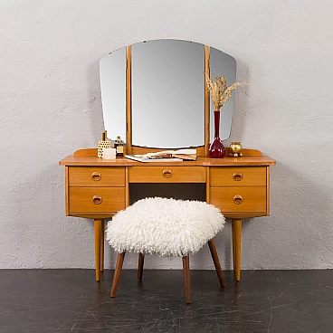 Oak and birch vanity table with folding mirror, 1970s. Featuring five drawers and a folding mirror, this oak veneered dressing table with solid wood details was made in Norway, most likely in the 1960s-70s. The pleasantly curved top and tapered legs in solid oak underline its Scandinavian origins. The legs are detachable, which makes transportation easier. The dressing table has been checked: all drawers are clean and work smoothly; the wood has been refurbished with layers of Danish oil. Small signs of use are left which do not ruin the aesthetics of the furniture and only confirm its originality. Excellent vintage condition with very slight traces of use. Central drawer height: 6 cm. Upper side drawer height: 8 cm. Lower drawer height: 11 cm. Footstool space: 52 x 40 cm.