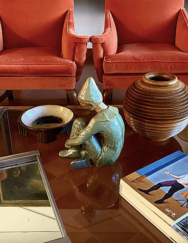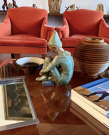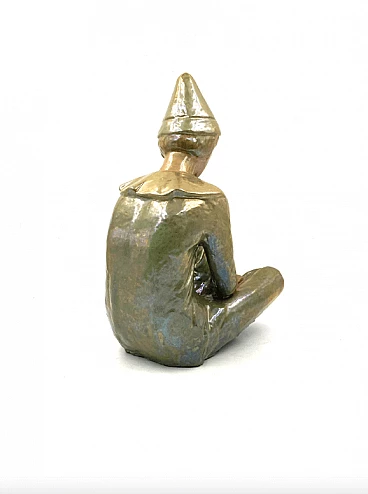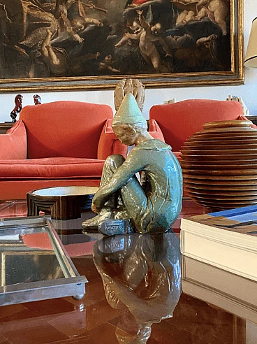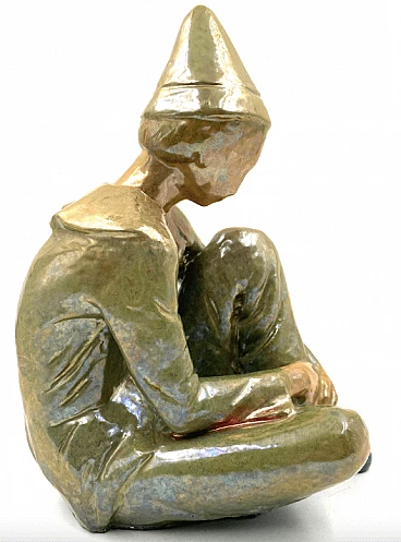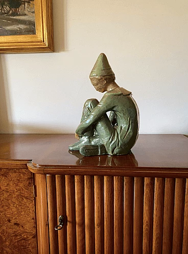 Giordano Tronconi, Seated boy, green ceramic figure from Faenza, 1950s