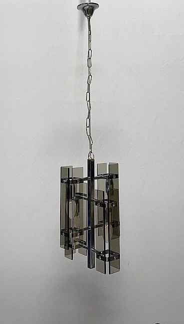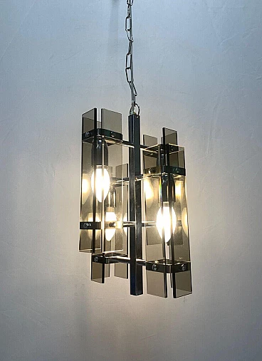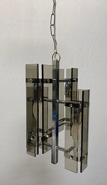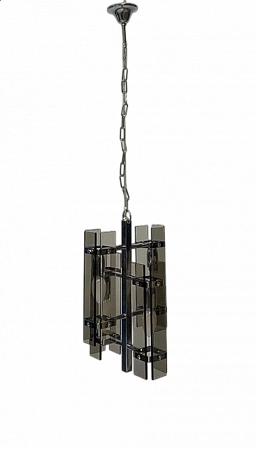 Fantastic chandelier from the 1970s circa in fair condition attributed to the firm Veca. It is all original, has very few signs of time, fantastic smoked glass, electrical system rebuilt and in working order. Wonderful transparent smoked glass. Each glass can be disassembled from the structure. Iron chandelier support structure.
