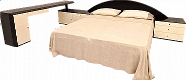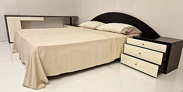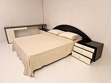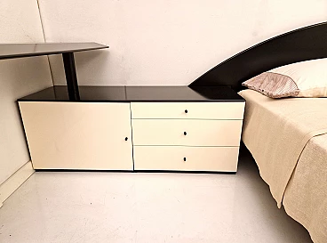 From left to right, the development is as follows: a closed-door storage unit with interior shelf, an under-top drawer, a free-standing compartment. Top top with gloss black lacquered beveled edge covering the whole. The free compartment leaves room for a small armchair and a makeup mirror. Below the top, at 90°, is a lower storage unit with a door, a nightstand-drawer unit with 3 drawers, one of which is high, the single double headboard with the characteristic crescent shape, lacquered black, and finally the second nightstand-drawer unit. The composition includes the bed frame and headboard only; not the bed. In case of purchase to the price of the composition must be added that of a 180x200 cm sommier (which may already be in the availability of the recipient). If necessary, the sommier is supplied at an additional price of € 1,400.00. The product is display and is in excellent overall condition no evidence of marks and/or scratches.