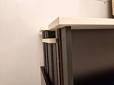 Iconic night composition designed by Renato Toso and Noti Massari for Stilwood, a leading company sensitive interpreter and witness of the 1970s. For the same company they have designed important designers, among which are highlighted the collaborations with Giovanni Ausenda, Roberto Pamio, Gigi Sabadin. Toso and Massari, architects and designers, collaborated with the most important companies of the 1970s, obtaining numerous awards. For Stilwood they have designed several collections of upholstered furniture including the modular DiedroNotte program. The composition we propose is angular, made of national walnut and bleached birch with a high-gloss lacquered finish in magnolia white for doors and drawer fronts; black color for the top, the interiors of storage units and drawers, and the sides.