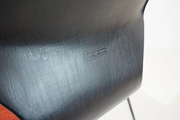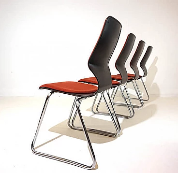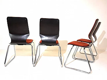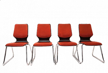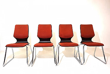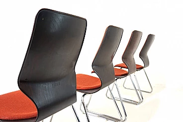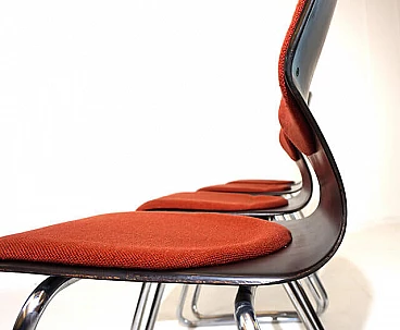 Four beautifully designed Flötotto chairs with a high back and upholstered seat and back shell. These chairs allow for very comfortable seating in combination with an iconic design. The Pagholz shells are in perfect condition. The seat cushions are in fireplace red fabric and show minimal signs of wear. The chrome chair rails are in excellent condition. The Flötotto company began using pagwood to make chair shells in the 1960s. Pagwood had the advantage of being very stable and could be molded into various shapes. Before long, Flötotto was known for developing ergonomic and dynamic shells.