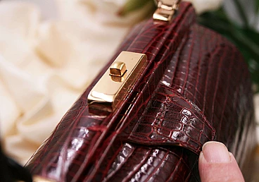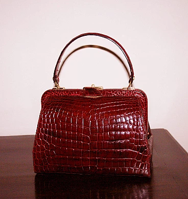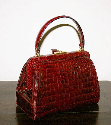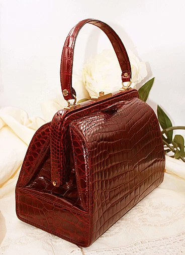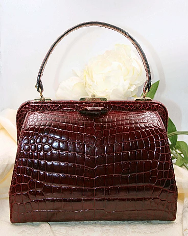 Vintage late 1950s, classic handbag, bowling bag type, for amateurs, in burgundy-coloured crocodile leather. Button opening. Peculiar and unique. Has a small lack near the button, a repair on the tab, which is not very noticeable. Good vintage condition. Unbranded. Perfect gift for someone who loves vintage and wants to be different. This bag is an item for true connoisseurs!