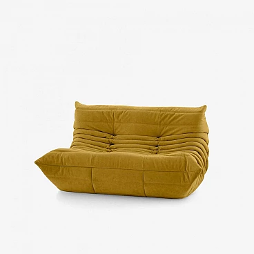 Togo Alcantara Curry two-seater sofa by Michel Ducaroy for Ligne Roset. The Togo model since 1973 has symbolized an iconic and avant-garde style. Togo's craftsmanship is unparalleled: it is made with a sturdy three-density polyurethane foam structure and soft polyurethane foam padding to ensure comfort and durability. This eye-catching sofa is characterized by pleated workmanship and soft, enveloping shapes. With over a million sold worldwide demonstrating its unrivaled ability to blend stylistically into both modern and traditional furnishings, our luxurious version of Alcantara Curry fabric offers an added level of comfort for ultimate relaxation. With its eye-catching design, impeccable construction and timeless detailing, this innovative piece will become the focal point of any room in your home.