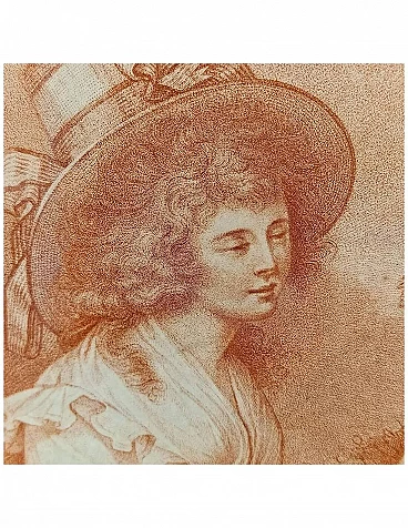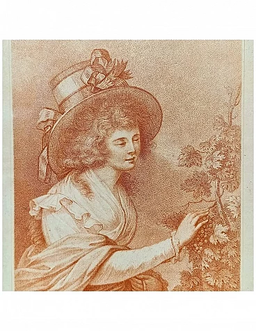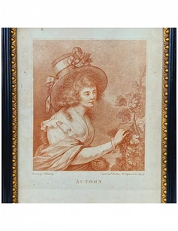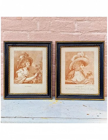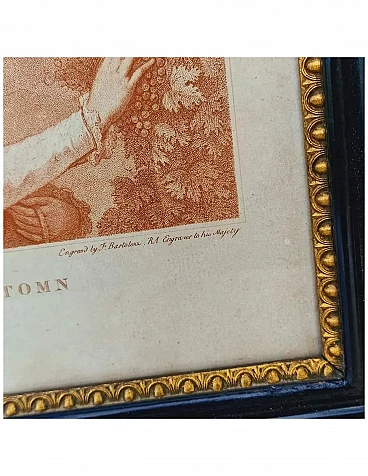 Pair of sanguine engravings "Automn" and "Summer" by Francesco Bartolozzi, 18th century. Engravings in the dotted manner, printed on laid paper with sanguine ink. The engraver Francesco Bartolozzi, born in Florence in 1727 and died in Lisbon in 1815, is among the most famous and appreciated Italian engravers; he successfully interpreted the various carving methods: etching, burin, dotted manner. Wagner's student in Venice, he then moved to London where he found international success and became the owner of his own workshop.