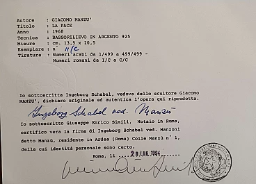 Giacomo Manzù, Peace, silver bas-relief, 1968