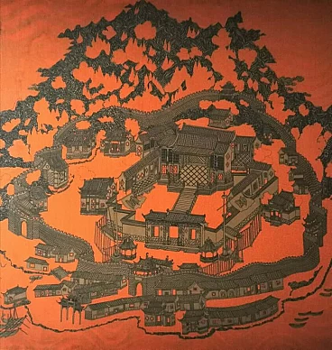 Fortified temple surrounded by pagodas, framed Chinese silk