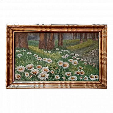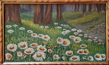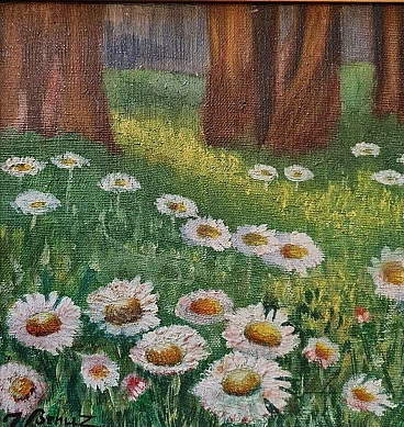 J. Benuz, landscape with daisies, oil painting on panel, 1940s