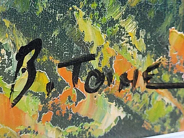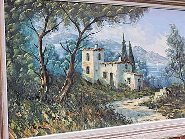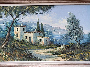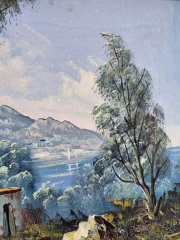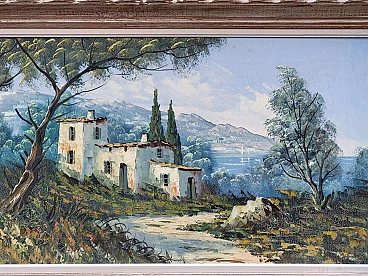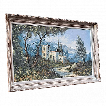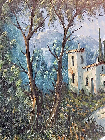 Mountain landscape with buildings, oil painting on canvas, 1940s