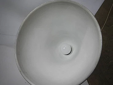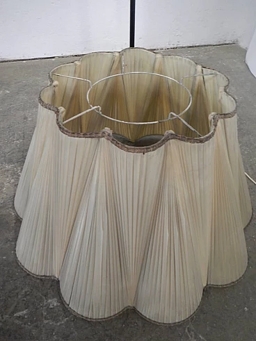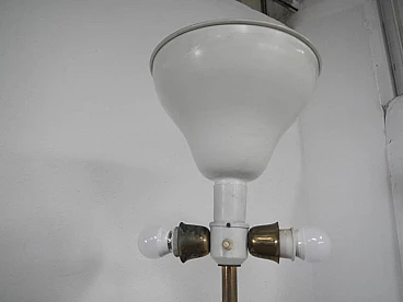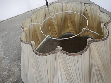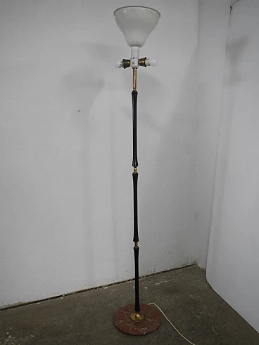 Metal floor lamp with pink marble base and black and brass-plated metal stem. The cap is made of wrinkled plastic resting on a coloured metal cap. Three lights with two on/off switches. Original and in working order.