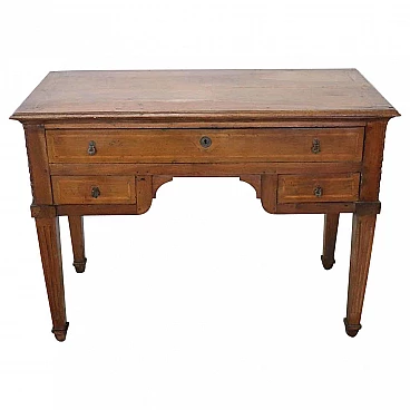 Elegant antique desk high eighteenth century full period Louis XVI. The desk is made of precious solid walnut with refined inlaid threads. Characterized by a simple and linear line as imposed by the taste of the period with truncated pyramidal grooved legs. On the front three practical drawers. Period nailing and joints present clearly visible. Antique desk perfectly in patina has not undergone invasive restorations and has signs related to wear and tear and the passage of time more than anything else in terms of finish. Price negotiable send us your proposals for purchase.