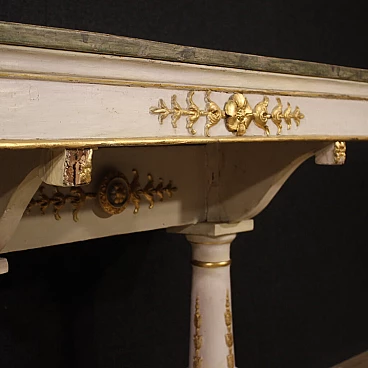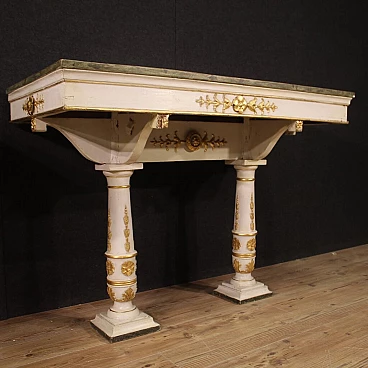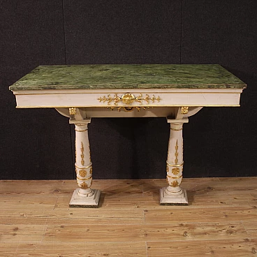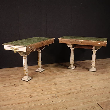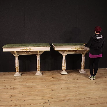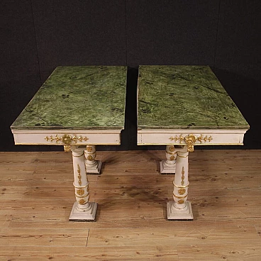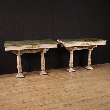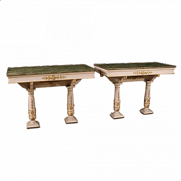Pair of late 19th century Genoese consoles. Carved, lacquered, gilded and painted wooden furniture in Empire style of beautiful line and pleasant decor. Pair of consoles to be fixed to the wall, ideal for inclusion in an important salon or study, to be combined with two mirrors or a pendant painting. High-quality lacquered faux-marble wooden tops (see photo) of good size and service. Tops not original, replaced during the 20th century. Consoles resting on two legs, of excellent solidity. Furniture finely adorned with gilded wooden decorations in relief (see photo) with a few small missing parts (see photo). Pair of consoles of great quality and charm, for antique dealers and interior decorators. Structurally sound and in beautiful patina, overall in good state of preservation.