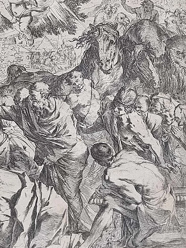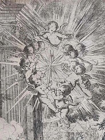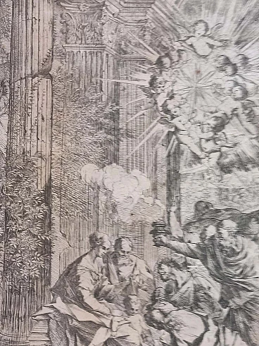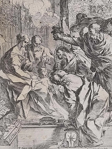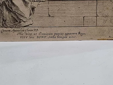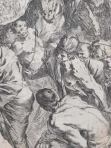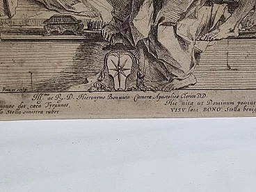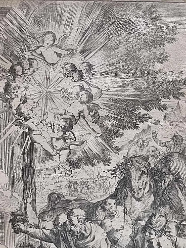 A beautiful engraving depicting the classic religious subject of the 'Adoration of the Magi' by the Baroque painter and engraver Pietro Testa known as il Lucchesino. The print derives from an oil on canvas of the same name in Montpelier. Identified by the monogram TPL on the right and the dedication signature. Paolo Bellini in his book "L'opera incisa di Pietro Testa", published in 1976 by Neri Pozza in Vicenza, identifies this work as an example of the third state of three because, compared to the second state, Giacomo Rossi's address has been added. In the lower margin is the dedication in Latin to: Illustrissimo e reverendissimo (cardinal) Gerolamo Bonvisi, Chierico della Camera Apostolica, D.D. The star on the left often blushes with the light of evil / The kings live here so that they may recognise the Lord, / the star with the happy and good face shines benignly./ Petrus Testa. Pietro Testa (1611-1650) was an Italian High Baroque artist active in Rome. Pietro Testa is best known as a printer and draughtsman.