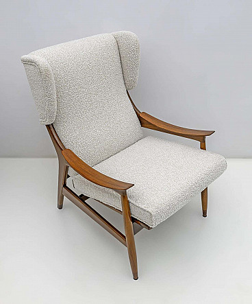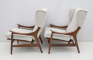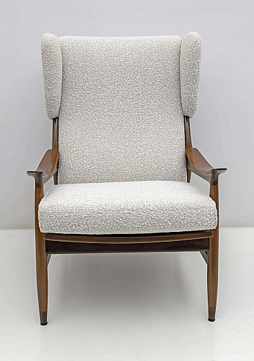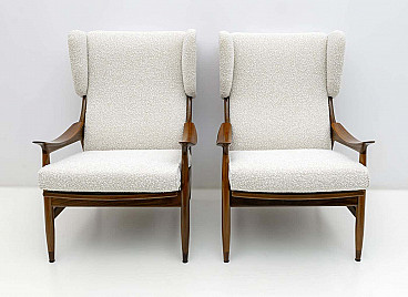 Manufactured in Italy in the 1950s by the Framar (Fratelli Marelli) company, this pair of lounge chairs is spectacular! With its lightweight teak wood frame, wing top and cantilever arms, these lounge chairs represent the best of elegant modern Italian design. Upholstered in fine bouclé, these lounge chairs are comfortable and beautiful at the same time. Perfect for a study, a fireplace, a reading corner or a living room, these armchairs simply ask you to sit down. These armchairs have been fully restored and upholstered, ready to furnish your home.