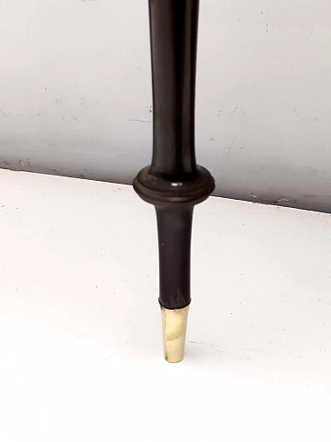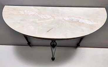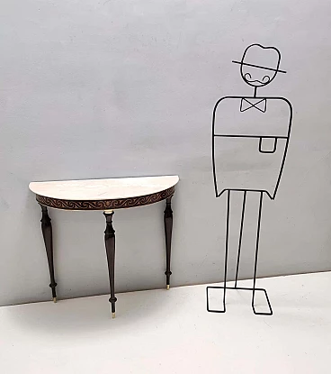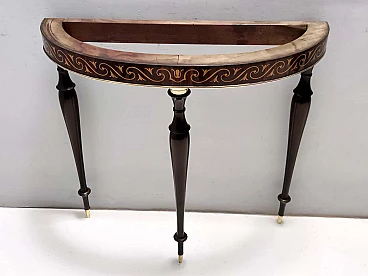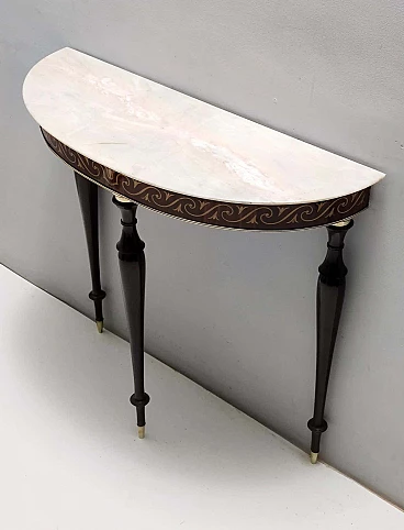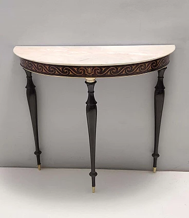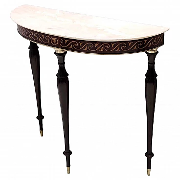 Half-moon console table, 1950s. Beech structure with black walnut and maple inlays, brass details and Rosa Portogallo marble top. It may show slight traces of use as it is vintage but can be considered to be in excellent original condition.