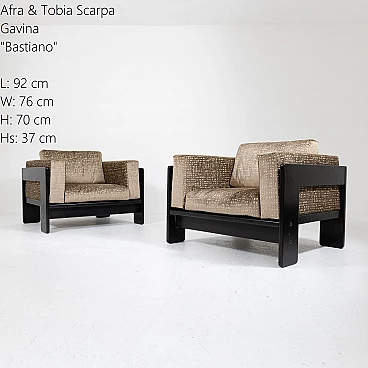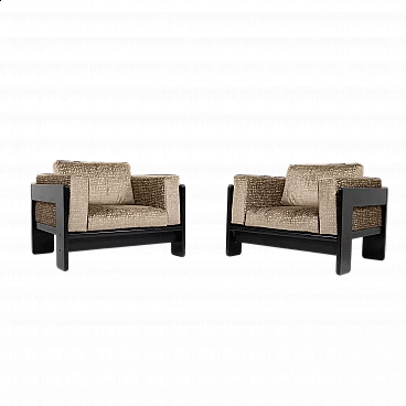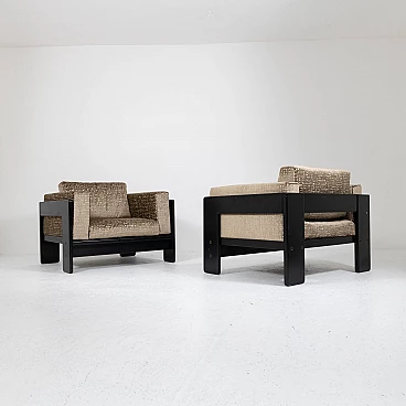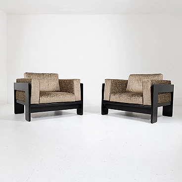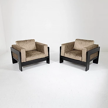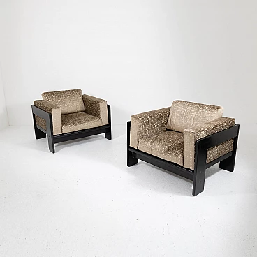 Pair of Bastiano armchairs by Afra and Tobia Scarpa for Gavina, 1960s. Structure in lacquered wood and cushions upholstered with new velvet fabric with brown geometric texture. Manufacturer's mark present. The wooden structure has cracks in the lacquering of the sides. Seat height: 37 cm.