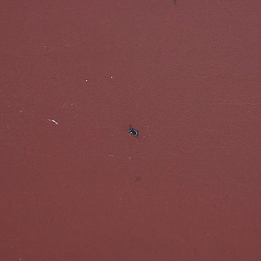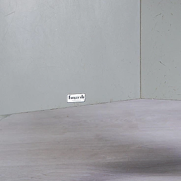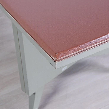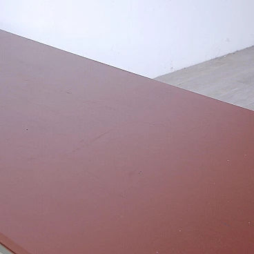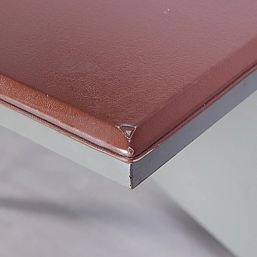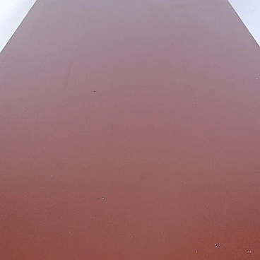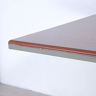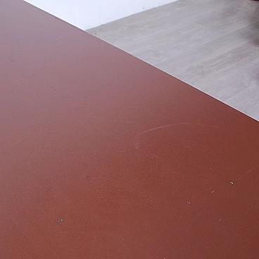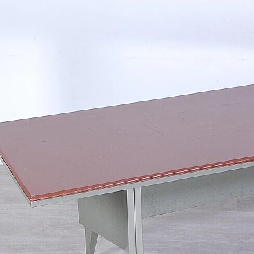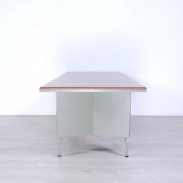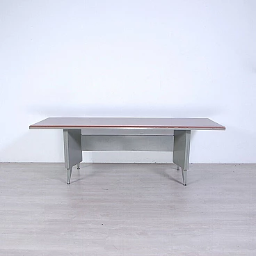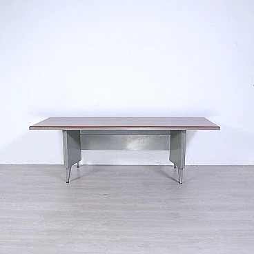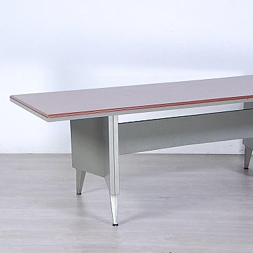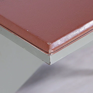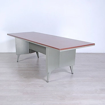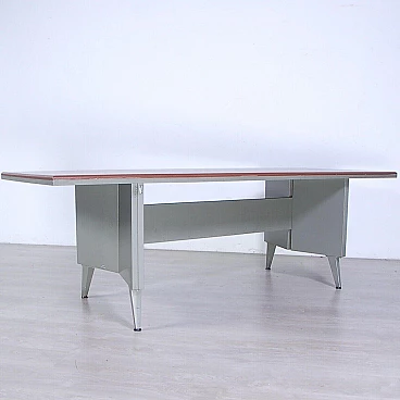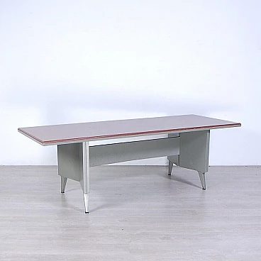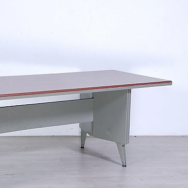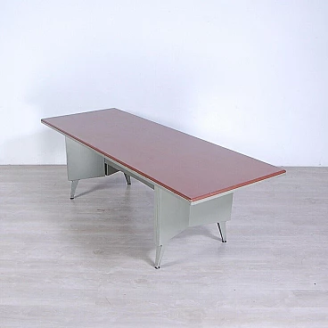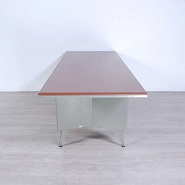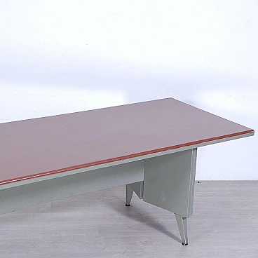 Imposing industrial table/desk, 1960s-70s. Solid structure in gray enamelled iron, well-studied design with "V" shaped leg block and half-height horizontal band; this creation creates plays of shadows and light that give depth, "lightening" the effect of the enormity of the table. The top is covered with brown skai. Brown on gray is the classic color combination of office/industrial furniture of the time, we find it in important brands such as Olivetti and Trau. On the side of the structure there is a metal label with the Finardi Bergamo brand.