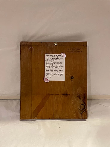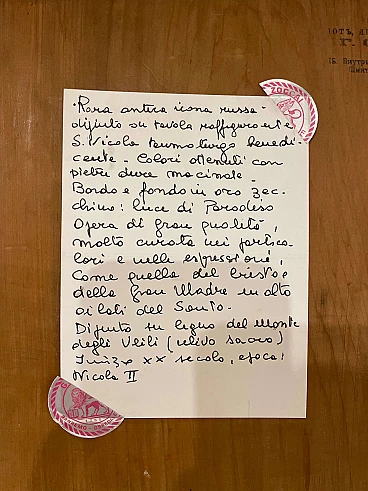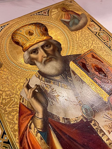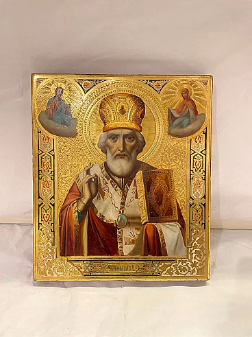 Antique Russian icon painted on wood from the Mount of Olives (sacred olive tree), depicting St Nicholas the Blessing Thaumaturge. Gold background and borders, work with great attention to detail and expression, especially Christ and the Madonna, positioned high up on either side of the saint. Executed in oriental colours with ground hard stones. Dating from the beginning of the 20th century, Nicholas II era.