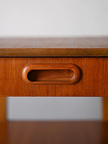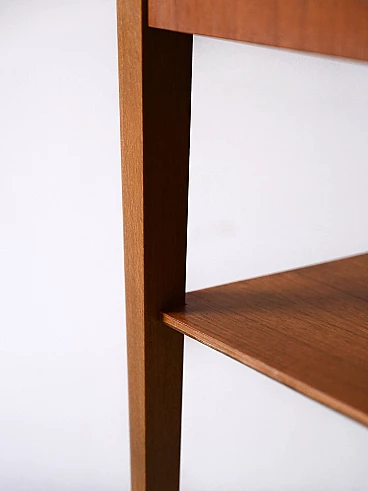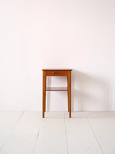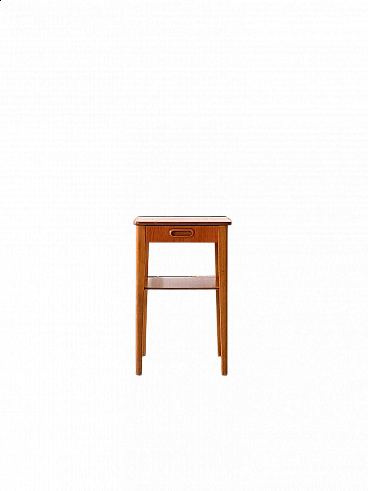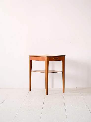 Scandinavian teak nightstand/coffee table with drawer and double shelf, 1960s. A piece of furniture in perfect Scandinavian style that traces the taste for simple, modern lines. Consisting of long tapered legs, a magazine rack shelf and a drawer with a carved wooden handle. The deep and narrow top allows for a large surface area while occupying little space in the room. Because of the simple, minimalist design, it can also be used as an entryway cabinet or as a side table alongside the sofa.