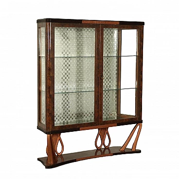Showcase in wood veneered with briarwood and rosewood. Carved geometrical decorations, bronzed lacquer, interior with mirrored gussets, back-treated glass tops. Product in good condition, shows small signs of wear.
