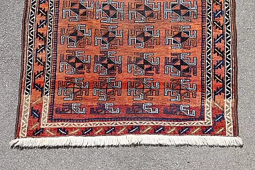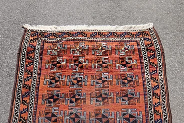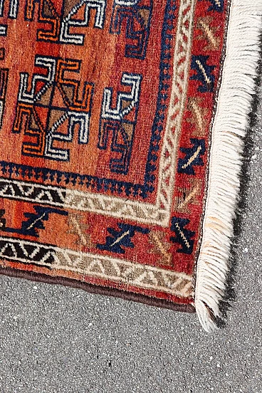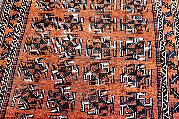 Beautiful Afghan Baluch rug of old manufacture (circa 1930s) with an unusual geometric tribal design and a combination of colours: red, white, black. This fantastic carpet is handmade from wool. Used, in good condition. We recommend, however, that you take a close look at all the attached photos. Offered at an excellent negotiable price, we invite you to send us your purchase proposals, we will evaluate them with pleasure. Measurements 105 X 150 cm. Professional packaging, insured shipping with couriers, delivery by appointment only on street level, no porterage on floors.