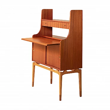 Small Swedish bookshop from the 50s with desk and shelf with teak doors. This particular piece of furniture performs several functions as required. The upper part consists of a shelf perfect for ordering books. Immediately below we find a thin secretaire with three shelves perfect for storing childhood love letters. The central part consists of a shelf with pull-out desk that transforms the cabinet into a work desk and a shelf with sliding doors with metal handle. The cabinet ends with long sculpted legs that make this piece of furniture characteristic and unique. The sober beauty and multi-functionality make this piece of furniture perfect to be inserted in a living room, at the entrance or in the bedroom, moreover given its small size it is suitable for small apartments.