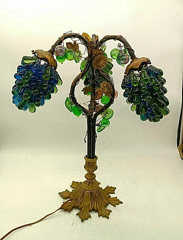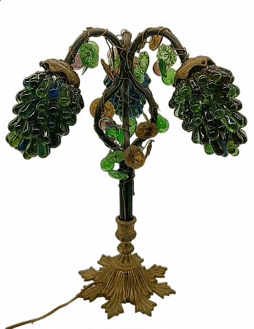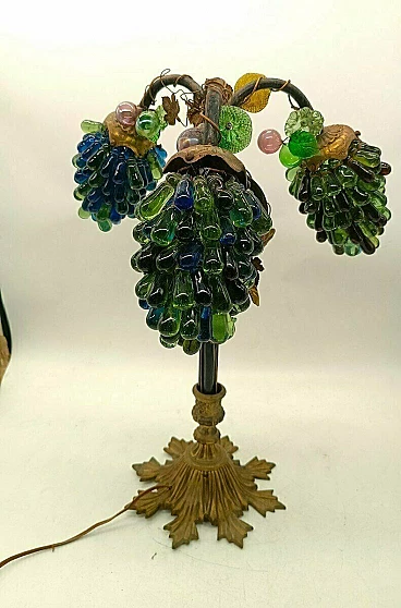 Art Nouveau style lamp with Murano glass shade in the shape of bunches of grapes. This Art Nouveau style lamp is a true masterpiece of design and craftsmanship, capturing the essence of the 20th century art movement. Its structure consists of a finely chiselled bronze base and an enamelled iron trunk, which acts as a support for a climbing plant. This plant, with its branches, shoots, leaves and flowers woven into the coloured glass, envelops the lamp like a real vine, creating an extraordinary fusion of nature and design. Measurements H. 53 cm W. 42 cm.