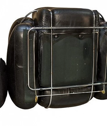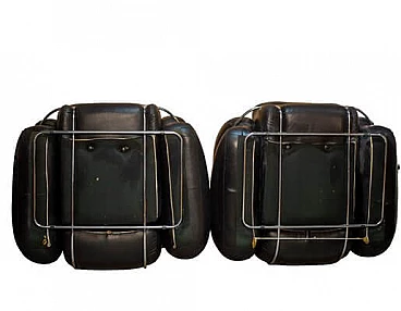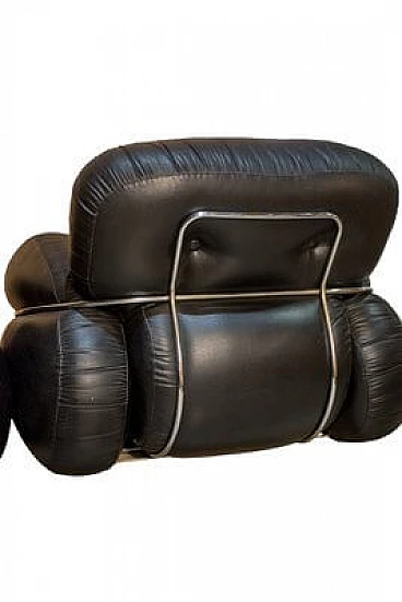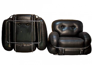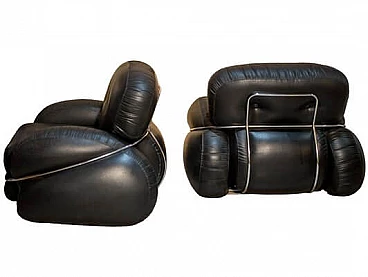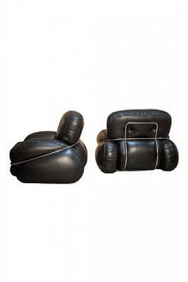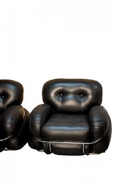 Pair of Okay armchairs in black skai and steel. The armchairs designed by Adriano Piazzesi and produced by Studio Tre D Firenze are distinguished not only by their well-known soft, rounded shape, but also by their incredible lightness in terms of weight. They are in fact extremely structured and comfortable seats, but designed to be moved with great ease, and therefore made of soft but non-deformable material. The steel bars that embrace them are in perfect structural and aesthetic condition, as are the original upholstery and padding. The upholstery has been cleaned and sanitised and has no cuts or cracks, but being made of Sky, and therefore a material similar to leather, it has a 'lived-in taste'. which is nevertheless pleasant.