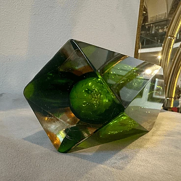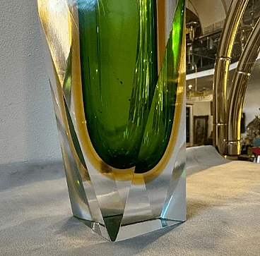 Vase by Seguso in green and yellow faceted submerged Murano glass, 1960s. Object in perfect condition designed and produced in Venice by Seguso. It is a vintage decorative piece that represents the distinct craftsmanship and design style of Murano glass from that era. Murano glass is world famous for its high quality and craftsmanship. It is known for its brilliance, richness of color and the skilled techniques employed by its artisans. Submerged glass is a special glass blowing technique developed in Murano: it involves layering different colors of glass to create a multi-layered effect. In this case, the vase features green and yellow layers. The outer layer is often a different color than the inner layer, creating a striking visual contrast. The vase is faceted, the flat and angled surfaces capture and reflect light differently. This design element gives the vase a unique and modern look. The vase's design aligns with mid-century modern design principles, featuring clean lines, geometric shapes, and an emphasis on form and function. The combination of green and yellow adds vibrancy and a playful touch to the vase. These colors are typical of mid-century modern design, which often incorporated bold, contrasting hues. Authentic Murano glass pieces from this era are highly collectible. The craftsmanship and artistic quality of Murano glass are highly prized and vases like this are sought after by collectors and enthusiasts.