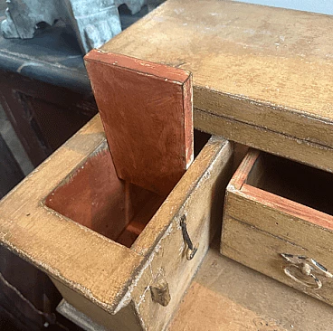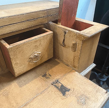 Louis Philippe orange and brown lacquered wood secrétaire, late 19th century. This piece of furniture serves as both a functional and aesthetically pleasing piece, showcasing the design sensibilities of its era with a bold and distinctive color choice. It is in good condition with normal signs of use and age. The secrétaire reflects the design aesthetic of the Louis Philippe era, characterized by simple, elegant lines, minimal ornamentation and attention to functionality. Made from lacquered wood, likely chosen for its durability, and featuring a vibrant finish; the orange lacquer adds a bold and unique touch to the piece. This secrétaire is equipped with a writing surface, storage compartments and drawers hidden behind a flap front; this element meets the functional needs of the time when writing letters and paperwork were common activities. The inside features various compartments and drawers to organize writing materials, documents and other items.