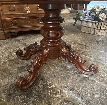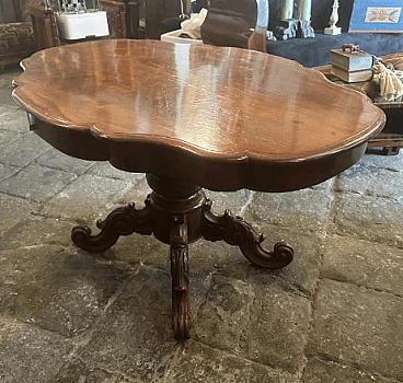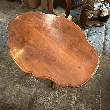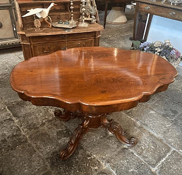 Sicilian Louis Philippe mahogany table, late 19th century (1880s). Furniture made of mahogany, a hardwood popular during the Louis Philippe era, known for its rich, dark color and fine grain. The table top is designed to emulate the shape of a turtle's shell, typical of Sicilian tables of the time. It is in good condition overall considering its use and age. The design reflects the characteristics of the Louis Philippe style of the late 19th century, with clean lines, subtle curves and minimal ornamentation. The shape of the top involves a carefully crafted curvature that mimics the distinctive look of a turtle's shell. Mahogany has a high-gloss finish to enhance its natural beauty and ensure its durability. Given the craftsmanship of the period, the table displays meticulous attention to detail in its construction and finish.