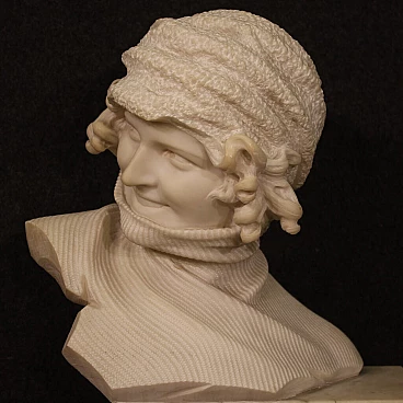 Italian sculpture from the first half of the 20th century. Marble work depicting young girl with turtleneck and winter hat of excellent quality. Center-finished sculpture of excellent workmanship; note the girl's ringlets and the minute details of the dress. Work that has a difficult-to-read signature on the right side of the base (see photo), under study. Object for antique dealers, interior decorators and collectors of marble sculptures, easily placed in various places in the house. It has minor scratches, no breaks or signs of restoration (see photo).