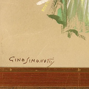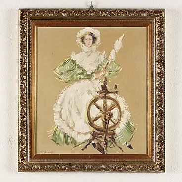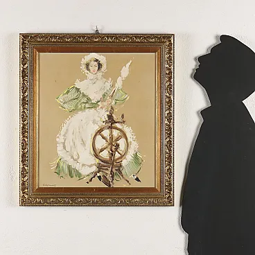 Gino Simonetti, woman at the spinning wheel, tempera painting on paper
