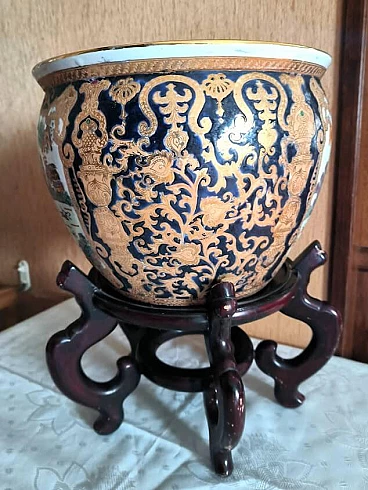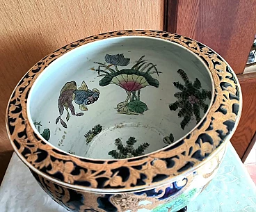 Chinese polychrome and gilded porcelain fish vase with wooden base, mid-20th century