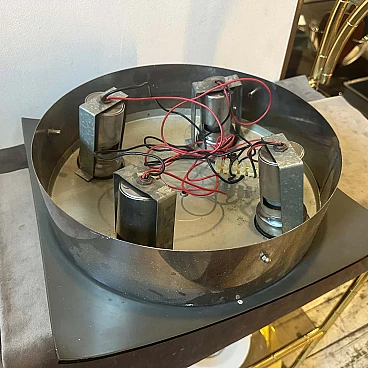 A four-light square lighting fixture designed and manufactured in Italy in the 1970s by Veca, the curved smoked mirror glass is in perfect condition. This Italian ceiling light by Veca encapsulates the essence of its time, displaying a futuristic, minimalist design with smoked mirror glass as the key material. It not only provides functional lighting, but is also an iconic representation of the Space Age design movement and Italian design excellence. The 1970s marked the height of the Space Age design movement, heavily influenced by futuristic themes, science fiction and space exploration. The square shape, a popular choice in the 1970s, adds a touch of modernity and symmetry to the design. The use of smoked mirrored glass in the lamp's construction creates a reflective surface with a smoky or coloured hue, contributing to a futuristic, space-inspired atmosphere. The light exhibits a minimalist, sleek and streamlined form, reflecting A Space AGE's emphasis on clean lines and simplicity. The design should emphasise functionality and aesthetics in harmony. The ceiling light provides illumination with four integrated lighting elements, concealed within the smoked mirror glass. Veca is an Italian lighting design company, known for its quality craftsmanship and attention to detail. This ceiling light is considered a symbol of the cultural and design influences of the 1970s, reflecting the era's fascination with space exploration and technology.
