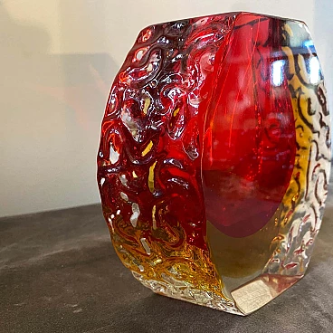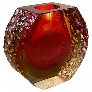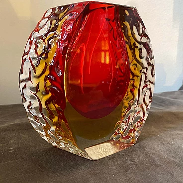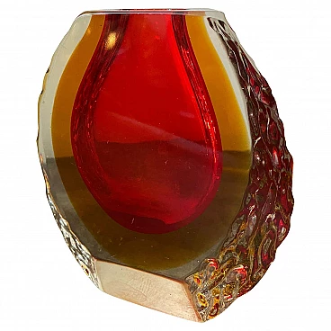 Red and yellow submerged Murano glass vase designed and produced in Venice in the 1960s by Mandruzzato, in perfect condition. This vase is a beautiful fusion of art and functionality. Featuring the iconic Sommerso technique, they embody the design principles of the Mid-Century Modern era and reflect the exquisite craftsmanship for which Murano glass is celebrated. The Sommerso technique is a method of working Murano glass that involves layering different colours of glass to create an extraordinary multi-dimensional effect. In this case, red and yellow layers are fused together, giving the vase a rich and vibrant appearance. The red and yellow colours add a touch of warmth and vibrancy to the décor. Murano glass is renowned for its exceptional craftsmanship.