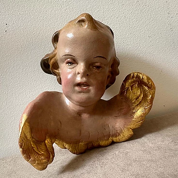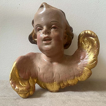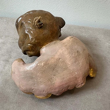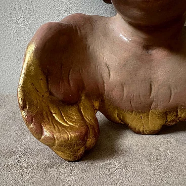 This ceramic angel is an eye-catching work of art, reflecting the ornamental and dramatic characteristics typical of the Baroque period. The work exudes a sense of opulence and drama, characteristic of the Baroque style that flourished in the 17th century and continued to influence artistic expression into the 19th century. The ceramic angel is a symphony of intricate detail, with elaborate flowing robes adorned in rich, vibrant colours. The sculptor paid meticulous attention to the delicate facial features that convey a combination of heavenly serenity and emotional intensity. The Putto is in perfect condition, with minor signs of use and age.