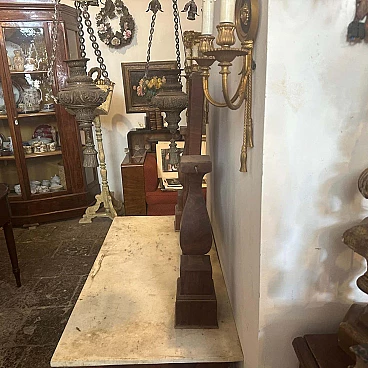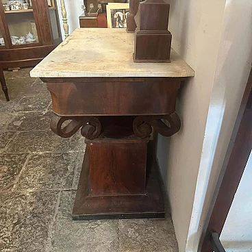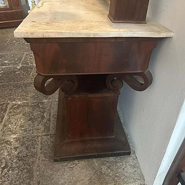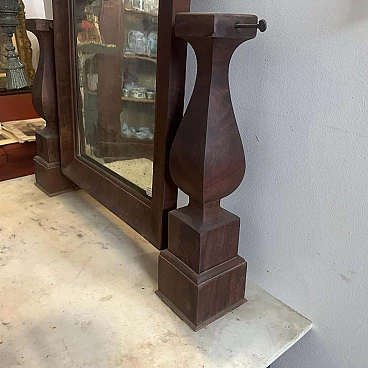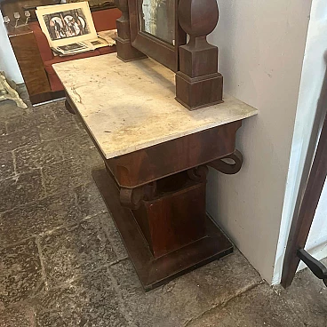 This Sicilian dressing table is an exquisite piece of furniture representative of the design and craftsmanship trends of the time. The main structural material is fir wood, chosen for its strength and workability. The exterior is veneered in mahogany, a wood prized for its richness of colour and grain, which guarantees durability and an opulent appearance. The vanity table The white marble top adds a touch of luxury and elegance. The dressing table incorporates a drawer and two compartments for storing toiletries, make-up or other personal items. These spaces are discreetly integrated into the design, maintaining the aesthetics of the table. The original mercury mirror lends a slightly distressed and antique look. The mirror is a focal point, serving a functional function and reflecting the design aesthetic of the time.