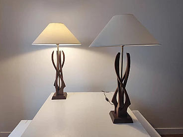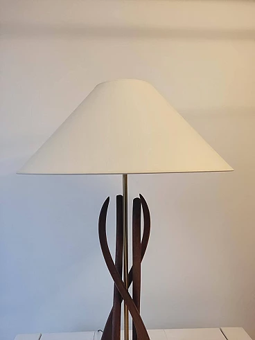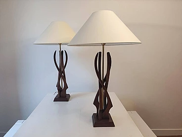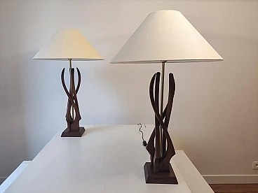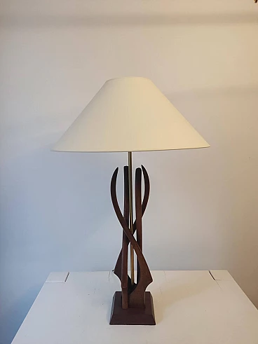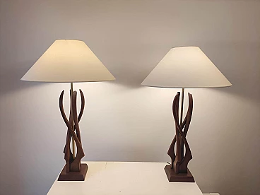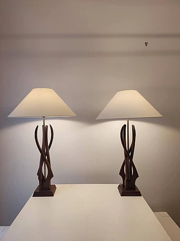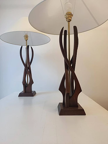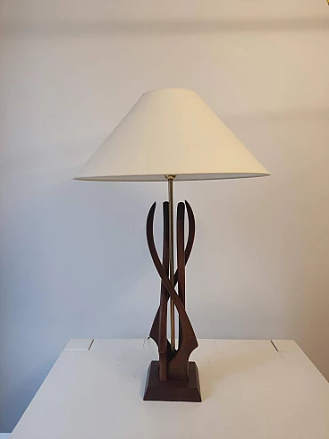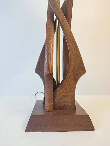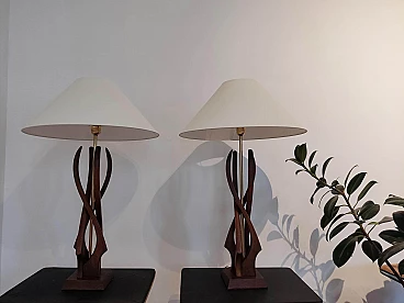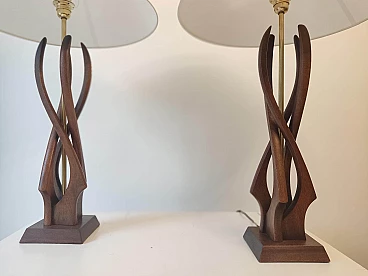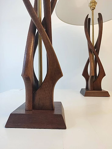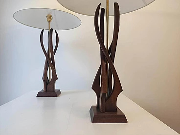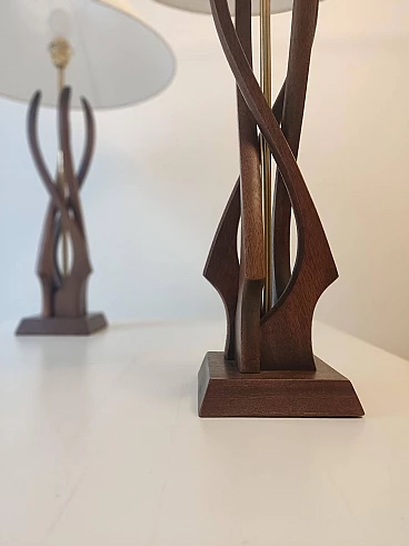 Pair of large vintage mid-20th century table lamps from the United States. Organic walnut frame accompanied by a brass rod. The Tonkinese shade and electrics are new by European standards. These tall lamps will give a lot of elegance and character to your interior.