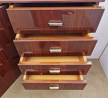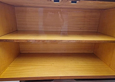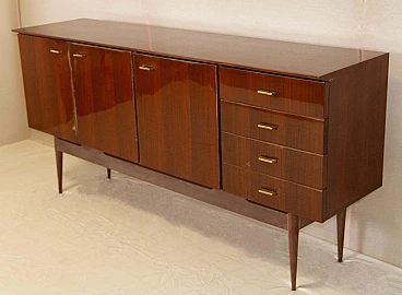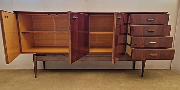 1950s living room sideboard veneered in mahogany essence with glossy finish. From left to right it consists of two symmetrically opening hinged doors with maple veneer interior shelf; single hinged door with maple veneer interior shelf; four drawers with mahogany fronts and maple interior.