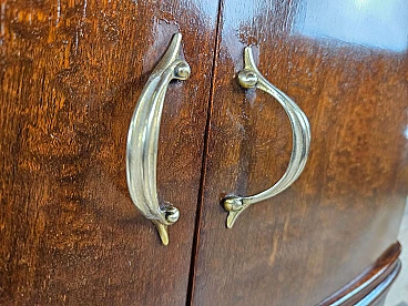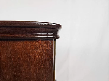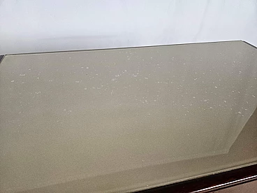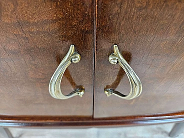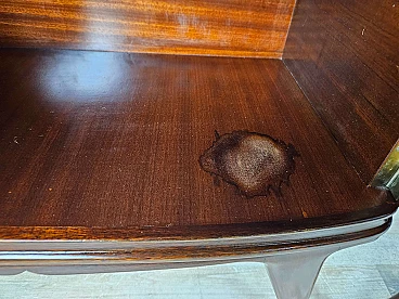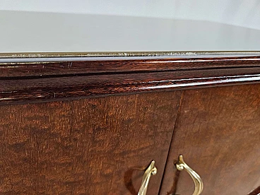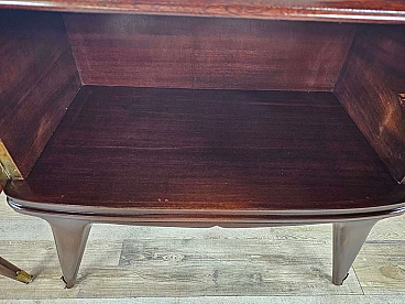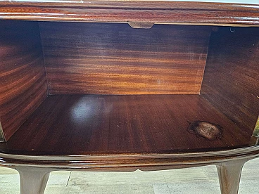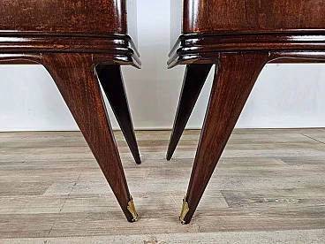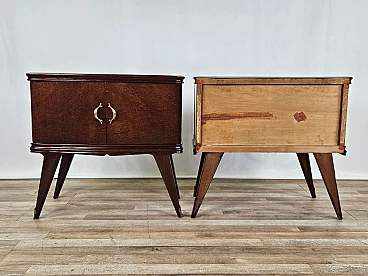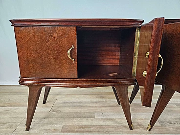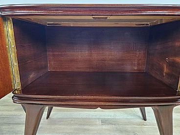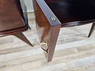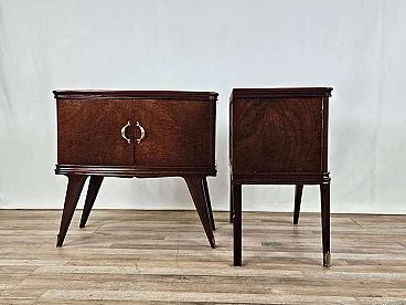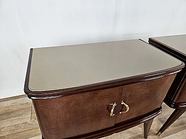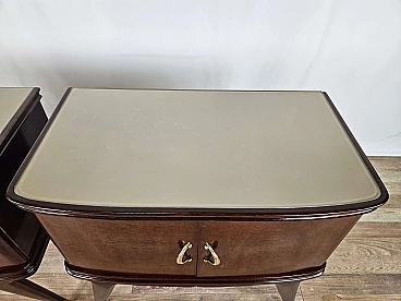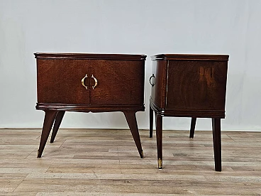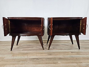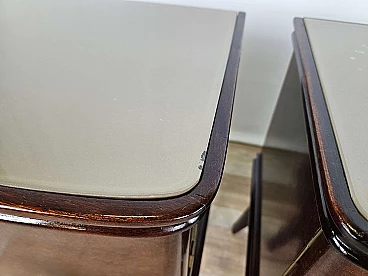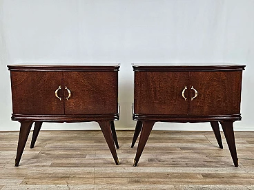 Pair of mahogany feather bedside tables with glass and brass handles, 1950s