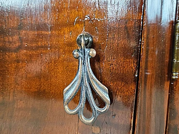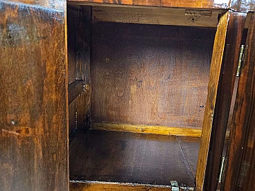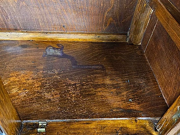 Art Deco bedroom or entryway vanity table/sideboard, early 1950s. Mahogany-root structure with four sturdy doors and ample inside space. Brass handles and distinctive black glass on the top. A piece of furniture conceived and designed for modern and antique settings as it can be placed in any room due to its linear size and small proportions. Polished with oil and shellac.