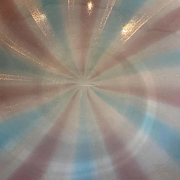 This is a round centrepiece designed and manufactured in Venice in the 1970s, in excellent condition. This bowl is a beautiful and potentially valuable piece. Venini's influence on Murano glass design in that era was significant, characterised by bright colours, bold designs and innovative techniques. The bowl has an elegant and sophisticated round shape, capturing the essence of Mid-Century Modern design. The colour palette is the highlight, with a harmonious blend of pink, turquoise and gold stripes. The pink is soft and subtle, the turquoise vibrant and eye-catching and the gold gives a touch of opulence. The interplay of these colours creates a dynamic and visually striking effect. The stripes are a prominent design element and create a sense of movement and rhythm. The precision and skill in making these stripes is indicative of the craftsmanship of Murano glass.