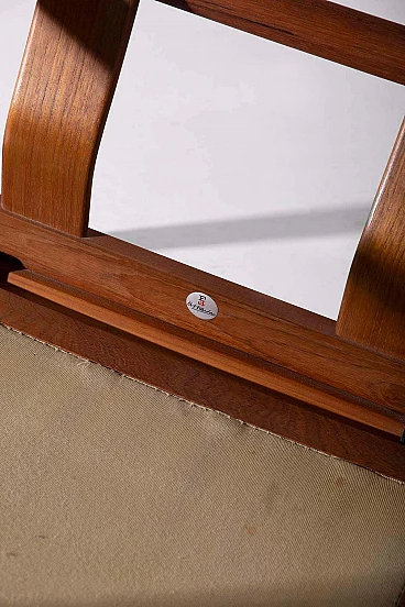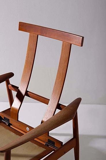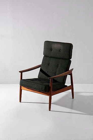 A vintage recliner by the famous Arne Vodder, made for France & Daverkosen in the 1950s, is a testimony to timeless design. Its authenticity is underlined by the presence of the original FD 164 label, a sign of its Danish heritage. This armchair boasts a remarkable feature: it can be reclined and offers three adjustable positions, testifying to Arne Vodder's innovation and commitment to comfort. When you plunge into it, you will experience a sense of luxurious relaxation that transcends time. What makes this piece truly exceptional is its enduring appeal, as it still proudly wears its remarkably well-preserved original greenish fabric of the era. This fabric not only tells a story of yesteryear, but also adds a unique character to the chair, making it a conversation piece in any room. The wooden frame boasts the unmistakable lines and aesthetics of Nordic design. It exudes the simplicity and functionality that Scandinavian design is famous for, making it perfect for contemporary spaces with a modernist twist.