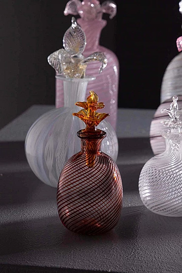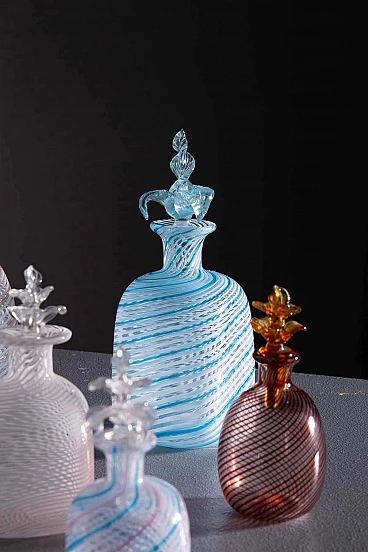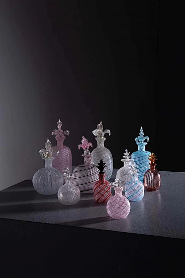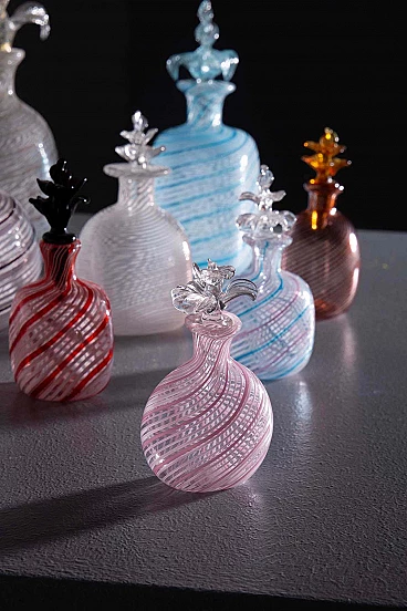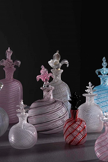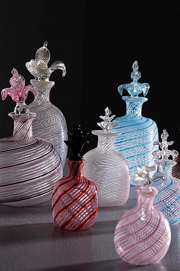 Ten exquisite decorative perfume ampoules made of precious Murano glass from the 1960s are a true artistic gem. This glass has been skilfully and creatively modelled by Italian master glassmakers, using a special technique called 'Filigrana', which creates vibrant and luminous shades of colour. Filigree is an ancient technique that involves the creation of intricate glass patterns, fused together with skill. Each Murano glass cruet is adorned with a stopper with various floral shapes, and the set includes cruets of different sizes, shapes and colours, ranging from various shades of the palette. These ampoules have been made entirely by hand in Italy, testifying to the high quality of Italian craftsmanship. The decorative Murano glass ampoules are marvellous works of art suitable for any environment. Their sparkling colours add boldness and vitality to the surroundings and can also be an ideal gift idea. These vials are in original, flawless vintage condition. Maximum height 14 cm (5.51 inches), maximum diameter 8 cm (3.14 inches), minimum height 7.5 cm (2.95 inches), minimum diameter 4.5 cm (1.77 inches).