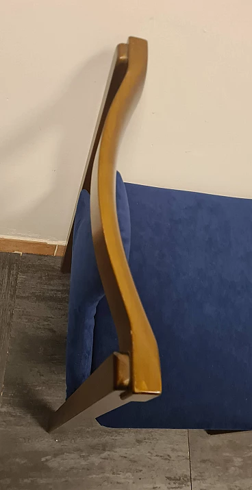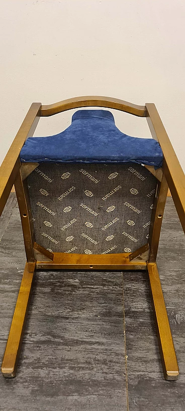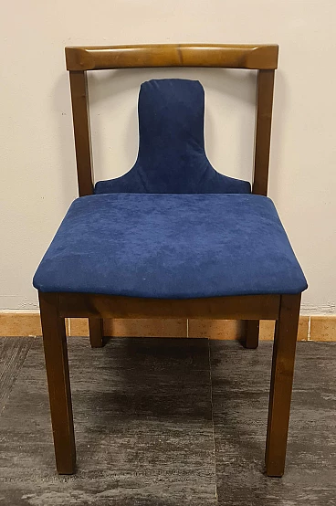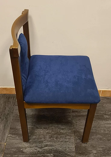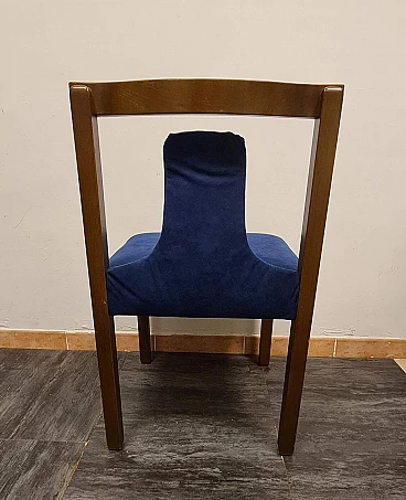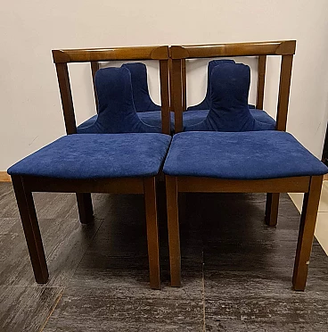 Group of four chairs designed by Claudio Salocchi for the Luigi Sormani's firm Sormani, 1960s-70s. The structure is made of wood, the seat and distinctive backrest have been reupholstered with midnight blue alcantara. Elegant and with a distinctive silhouette, these chairs are ideal to accompany any dining or office table. Very good state of preservation: the upholstery has been replaced and the wood has no structural defects, only some slight signs of time as shown in the photos.