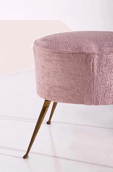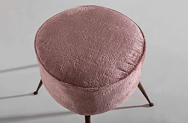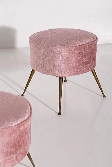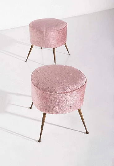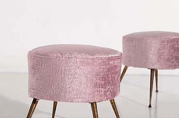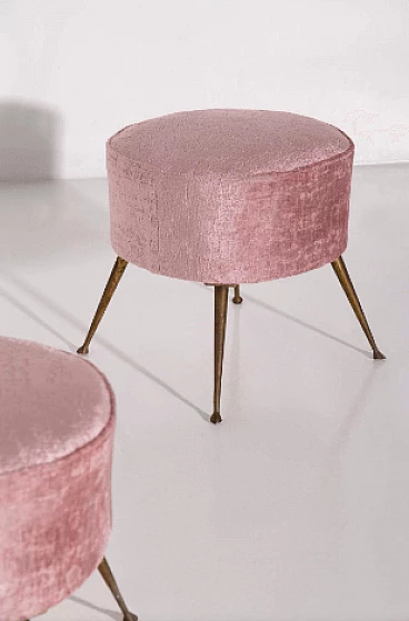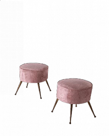 Imagine entering a time capsule, where the craftsmanship of 1950s Italy unfolds before your eyes. Admire this delightful pair of poufs, testimony to excellence and elegance in design. The very essence of Italian art is captured in every detail. See the conical brass feet and legs, which taper gracefully to an elegant pointed foot. A nice touch are the rubber pads underneath which ensure your floors remain pristine, a testament to the manufacturers' meticulous care. Circular in shape, the pouf is covered in newly renovated pink-lilac velvet, a fabric choice that exudes elegance and refinement. This velvet, so delicate to the touch, drapes over the poufs like a royal robe, inviting you to abandon yourself to its comfort. Inside, the springs remain true to their era, a piece of history preserved over time. When you sit on these ottomans, you are cradled by the same springs that embraced those who came before you, a connection to a bygone era. Perfectly at home in the most glamorous living rooms or bedrooms, these poufs exude a timeless charm that transforms any space. These are no mere pieces of furniture but embodiments of mid-century modern Italian design, crafted with unparalleled skill and vision. By bringing these poufs to your home, you are not only purchasing a Made in Italy product but also embracing a slice of Italian design history. These ottomans are a tribute to the ingenuity of Italian artisans and the enduring beauty of mid-century modern design, a treasure that will continue to captivate the hearts of generations to come.